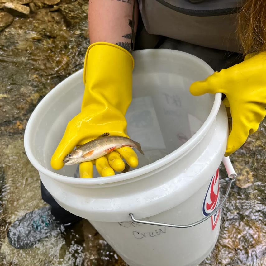 To survey aquatic life, the brook trout crew stuns them temporarily, puts fish in a bucket, and measure them before releasing them back into the wild. Photo: Katie Myers / Blue Ridge Public Radio / Grist